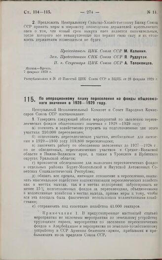 Постановление Центрального Исполнительного Комитета и Совета Народных Комиссаров. По операционному плану переселения на фонды общесоюзного значения в 1928—1929 году. 13 февраля 1929 г.