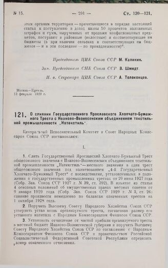 Постановление Центрального Исполнительного Комитета и Совета Народных Комиссаров. О слиянии Государственного Ярославского Хлопчато-Бумажного Треста с Иваново-Вознесенским объединением текстильной промышленности „Ивтекстиль". 13 февраля 1929 г.