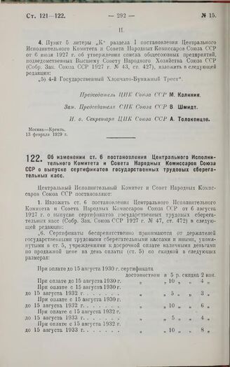 Постановление Центрального Исполнительного Комитета и Совета Народных Комиссаров. Об изменении ст. 6 постановления Центрального Исполнительного Комитета и Совета Народных Комиссаров Союза ССР о выпуске сертификатов государственных трудовых сберегательных касс. 20 февраля 1929 г. // Распубликовано в № 45 Известий ЦИК Союза ССР и ВЦИК от 23 февраля 1929 г.