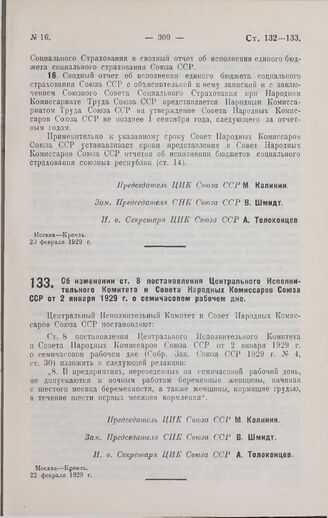Постановление Центрального Исполнительного Комитета и Совета Народных Комиссаров. Об изменении ст. 8 постановления Центрального Исполнительного Комитета и Совета Народных Комиссаров Союза ССР от 2 января 1929 г. о семичасовом рабочем дне. 22 февра...