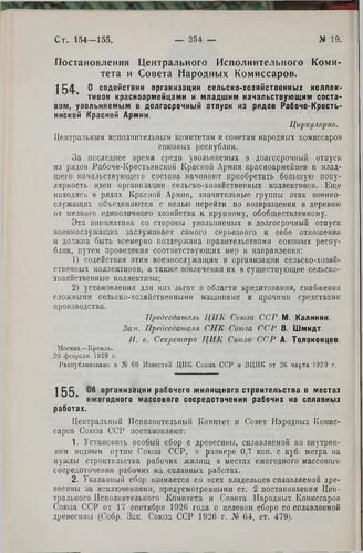 Постановление Центрального Исполнительного Комитета и Совета Народных Комиссаров. Об организации рабочего жилищного строительства в местах ежегодного массового сосредоточения рабочих на сплавных работах. 6 марта 1929 г.