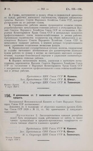 Постановление Центрального Исполнительного Комитета и Совета Народных Комиссаров. О дополнении ст. 2 положения об обществах взаимного кредита. 6 марта 1929 г.