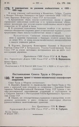 Постановление Совета Труда и Обороны. Об издании правил о технико-экономической классификации сооружений. 26 февраля 1929 г.