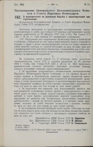 Постановление Центрального Исполнительного Комитета и Совета Народных Комиссаров. О мероприятиях по усилению борьбы с транспортными преступлениями. 13 марта 1929 г.