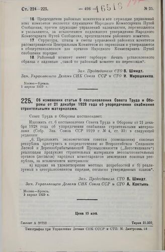 Постановление Совета Труда и Обороны. Об изменении статьи 6 постановления Совета Труда и Обороны от 21 декабря 1928 года об упорядочении снабжения строительными материалами. 3 апреля 1929 г.