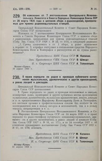 Постановление Центрального Исполнительного Комитета и Совета Народных Комиссаров. Об изменении ст. 7 постановления Центрального Исполнительного Комитета и Совета Народных Комиссаров Союза ССР от 26 марта 1926 года о целевом сборе с радиоизделий, п...
