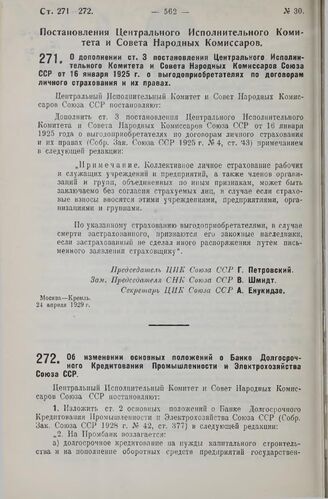 Постановление Центрального Исполнительного Комитета и Совета Народных Комиссаров. Об изменении основных положений о Банке Долгосрочного Кредитования Промышленности и Электрохозяйства Союза ССР. 24 апреля 1929 г.