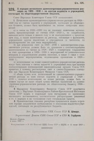Постановление Совета Народных Комиссаров. О порядке исчисления административно-управленческих расходов на 1929—1930 г. по сметам ведомств и учреждений, состоящих на общегосударственном бюджете. 4 июня 1929 г.