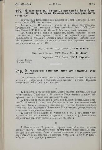 Постановление Центрального Исполнительного Комитета и Совета Народных Комиссаров. Об уменьшении налоговых льгот для кредитных учреждений. 12 июня 1929 г. // Распубликовано в № 143 Известий ЦИК Союза ССР и ВЦИК от 26 июня 1929 г.