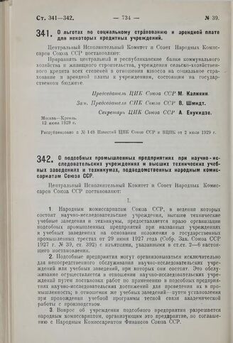 Постановление Центрального Исполнительного Комитета и Совета Народных Комиссаров. О льготах по социальному страхованию и арендной плате для некоторых кредитных учреждений. 12 июня 1929 г. // Распубликовано в № 148 Известий ЦИК Союза ССР и ВЦИК от 2 июля 1929 г.