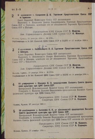 Об утверждении т. Манцева В. Н. председателем Высшего Совета физической культуры при ЦИК Союза ССР. 27 декабря 1934 г.