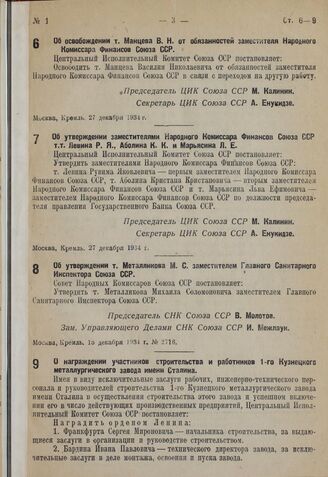Об освобождении т. Манцева В. Н. от обязанностей заместителя Народного Комиссара Финансов Союза ССР. 27 декабря 1934 г.