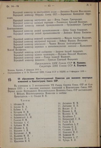 Постановление 1-й сессии Центрального Исполнительного Комитета Союза ССР 7 созыва. Об образовании Конституционной Комиссии для внесения некоторых изменений в Конституцию Союза ССР. 7 февраля 1935 г. // Опубликовано в № 34 Известий ЦИК Союза ССР и ВЦИК от 8 февраля 1935 г.