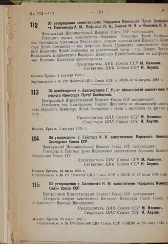 Об освобождении т. Благонравова Г. И. от обязанностей заместителя Народного Комиссара Путей Сообщения. 3 августа 1935 г.