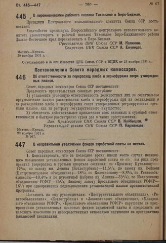 Постановление Совета народных комиссаров. О неправильном увеличении фондов заработной платы на местах. 17 ноября 1931 г. № 949