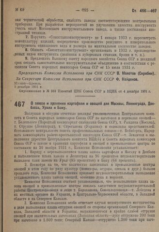 Постановление Комиссии Исполнения при СНК Союза ССР. О завозе и хранении картофеля и овощей для Москвы, Ленинграда, Донбасса, Урала и Баку. 3 декабря 1931 г. // Опубликовано в № 333 Известий ЦИК Союза ССР и ВЦИК от 4 декабря 1931 г.