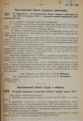 Постановление Совета труда и обороны. О порядке проведения контрактации Табаков и махорки урожая 1932 г. 25 декабря 1931 г. № 635