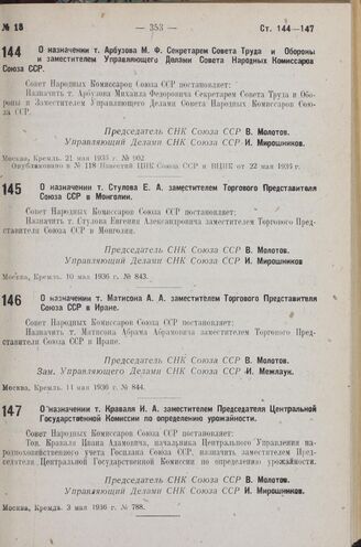 О назначении т. Арбузова М. Ф. Секретарем Совета Труда и Обороны и заместителем Управляющего Делами Совета Народных Комиссаров Союза ССР. 21 мая 1936 г. № 902