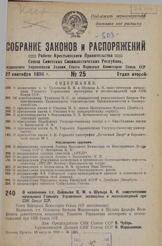 О назначении т.т. Соловьева В. М. и Шульца А. И. заместителями начальника Главного Управления лесоохраны и лесонасаждений при СНК Союза ССР. 15 августа 1936 г. № 1484