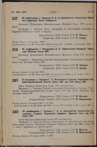 О назначении т. Ушакова Г. А. Начальником Главного Управления Гидрометеорологической Службы Союза ССР при СНК Союза ССР. 14 ноября 1936 г. № 1982 // Опубликовано в № 264 Известий ЦИК Союза ССР и ВЦИК от 15 ноября 1936 г.