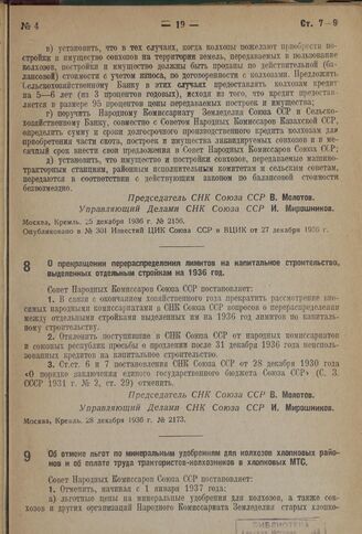 Постановление Совета Народных Комиссаров. Об отмене льгот по минеральным удобрениям для колхозов хлопковых районов и об оплате труда трактористов-колхозников в хлопковых МТС. 30 декабря 1936 г. № 2186