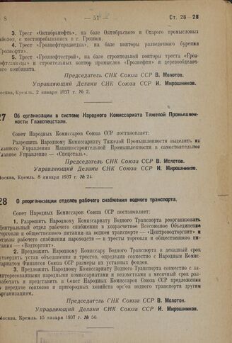 Постановление Совета Народных Комиссаров. О реорганизации отделов рабочего снабжения водного транспорта. 15 января 1937 г. № 56
