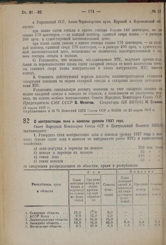Постановление Совета Народных Комиссаров Союза ССР и Центрального Комитета ВКП(б). О контрактации льна и конопли урожая 1937 года. 23 марта 1937 г.