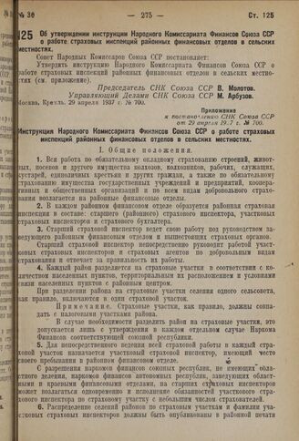 Постановление Совета Народных Комиссаров. Об утверждении инструкции Народного Комиссариата Финансов Союза ССР о работе страховых инспекций районных финансовых отделов в сельских местностях. 29 апреля 1937 г. № 700