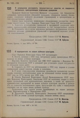Постановление Совета Народных Комиссаров. О мероприятиях по новым лубяным культурам. 3 мая 1937 г. № 707