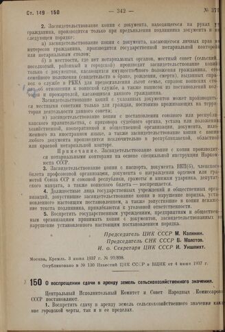 Постановление Центрального Исполнительного Комитета и Совета Народных Комиссаров. О воспрещении сдачи в аренду земель сельскохозяйственного значения. 4 июня 1937 г. № 99/900 // Опубликовано в № 131 Известий ЦИК СССР и ВЦИК от 5 июня 1937 г.