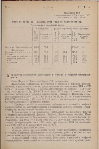 Постановление Совета Народных Комиссаров. О льготах колхозникам, работающим в угольной и торфяной промышленности. 13 февраля 1938 г. № 160