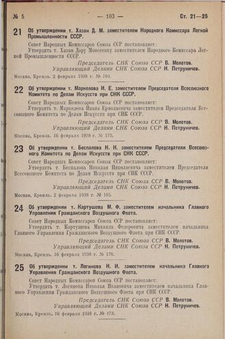 Постановление Совета Народных Комиссаров. Об утверждении т. Картушева М. Ф. заместителем начальника Главного Управления Гражданского Воздушного Флота. 16 февраля 1938 г. № 176