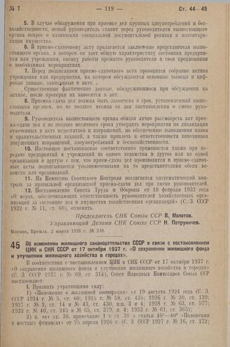 Постановление Совета Народных Комиссаров. Об изменении жилищного законодательства СССР в связи с постановлением ЦИК и СНК СССР от 17 октября 1937 г. «О сохранении жилищного фонда и улучшении жилищного хозяйства в городах». 13 февраля 1938 г. № 164