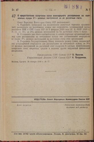 Постановление Совета Народных Комиссаров. О предоставлении хозорганам права внеочередного расходования на неотложные нужды 5% дневных поступлений на их расчетные счета. 26 января 1938 г. № 77