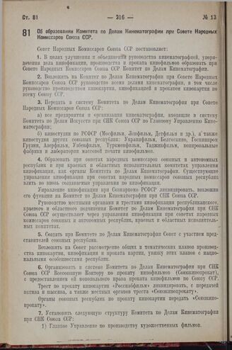 Постановление Совета Народных Комиссаров. Об образовании Комитета по Делам Кинематографии при Совете Народных Комиссаров Союза ССР. 23 марта 1938 г. № 382