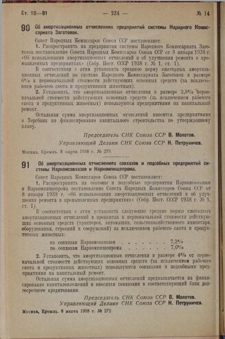 Постановление Совета Народных Комиссаров. Об амортизационных отчислениях предприятий системы Народного Комиссариата Заготовок. 8 марта 1938 г. № 279