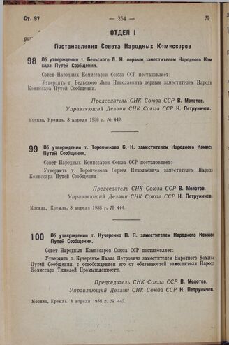 Постановление Совета Народных Комиссаров. Об утверждении т. Кучеренко П. П. заместителем Народного Комиссара Путей Сообщения. 8 апреля 1938 г. № 445