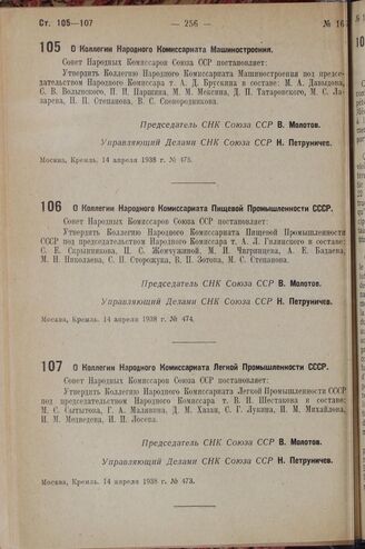 Постановление Совета Народных Комиссаров. О Коллегии Народного Комиссариата Легкой Промышленности СССР. 14 апреля 1938 г. № 473