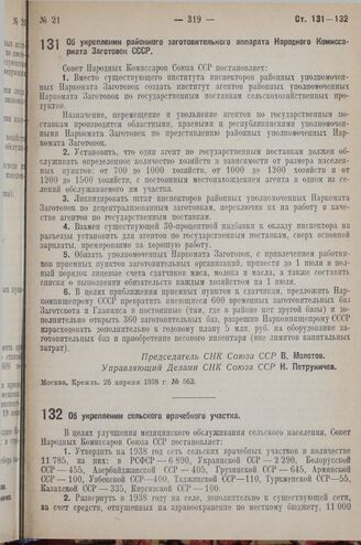 Постановление Совета Народных Комиссаров. Об укреплении районного заготовительного аппарата Народного Комиссариата Заготовок СССР. 26 апреля 1938 г. № 563