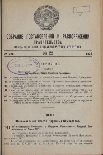Постановление Совета Народных Комиссаров. Об утверждении Положения о Народном Комиссариате Пищевой Промышленности Союза ССР. 5 мая 1938 г. № 594