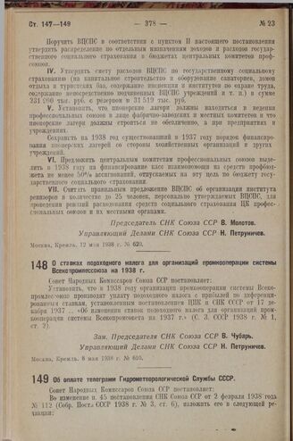 Постановление Совета Народных Комиссаров. О ставках подоходного налога для организаций промкооперации системы Всекопромлессоюза на 1938 г. 8 мая 1938 г. № 610