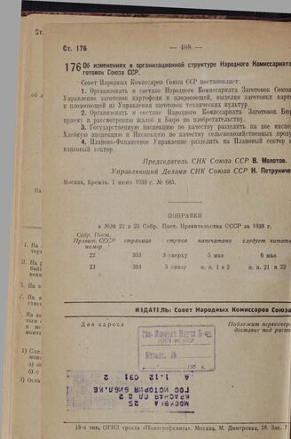 Постановление Совета Народных Комиссаров. Об изменениях в организационной структуре Народного Комиссариата заготовок Союза ССР. 1 июня 1938 г. № 685