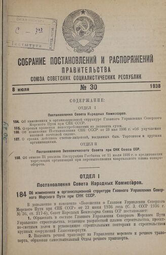 Постановление Совета Народных Комиссаров. Об изменениях в организационной структуре Главного Управления Северного Морского Пути при СНК СССР. 25 июня 1938 г. № 778