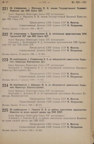 Постановление Совета Народных Комиссаров. Об освобождении т. Тищенко И. А. от работы заместителя председателя Комитета по делам высшей школы при СНК СССР. 16 июля 1938 г. № 832