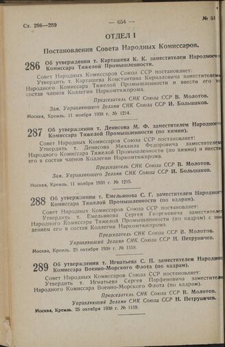 Постановление Совета Народных Комиссаров. Об утверждении т. Карташева К. К. заместителем Народного Комиссара Тяжелой Промышленности. 11 ноября 1938 г. № 1214