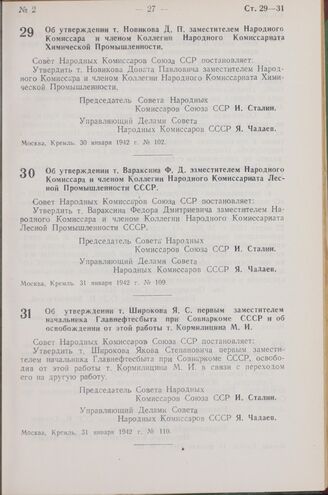 Постановление Совета Народных Комиссаров Союза ССР. Об утверждении т. Вараксина Ф. Д. заместителем Народного Комиссара и членом Коллегии Народного Комиссариата Лесной Промышленности СССР. 31 января 1942 г. № 109