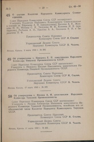 Постановление Совета Народных Комиссаров Союза ССР. О составе Коллегии Народного Комиссариата Станкостроения. 2 марта 1942 г. № 282