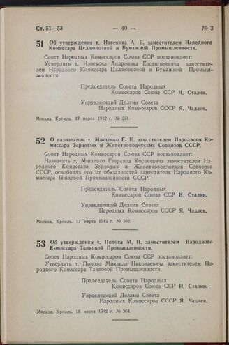Постановление Совета Народных Комиссаров Союза ССР. Об утверждении т. Попова М. Н. заместителем Народного Комиссара Танковой Промышленности. 18 марта 1942 г. № 364