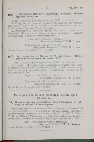 Постановление Совета Народных Комиссаров Союза ССР. О заместителе Народного Комиссара Среднего Машиностроения по кадрам. 22 декабря 1942 г. № 2018