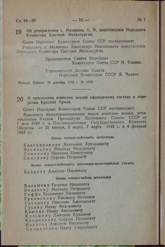О присвоении воинских званий офицерскому составу и генералам Красной Армии. Постановление Совета Народных Комиссаров Союза ССР. 24 декабря 1943 г. № 1416